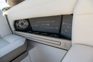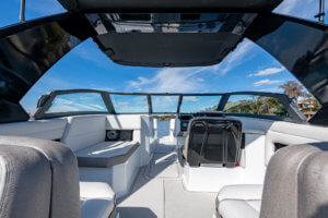 Three seating areas on the Ingenity EL create the ideal environment for all aboard. The bow has an optimal “round robin” arrangement. The wind gate can be opened up for a clear passage from bow to stern. The mid ship hosts shaded relaxation while the stern cascades down into a natural invitation to the water.